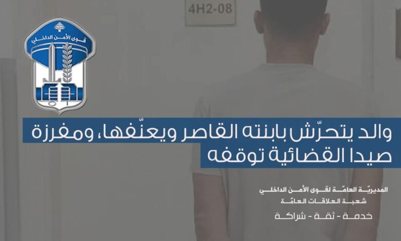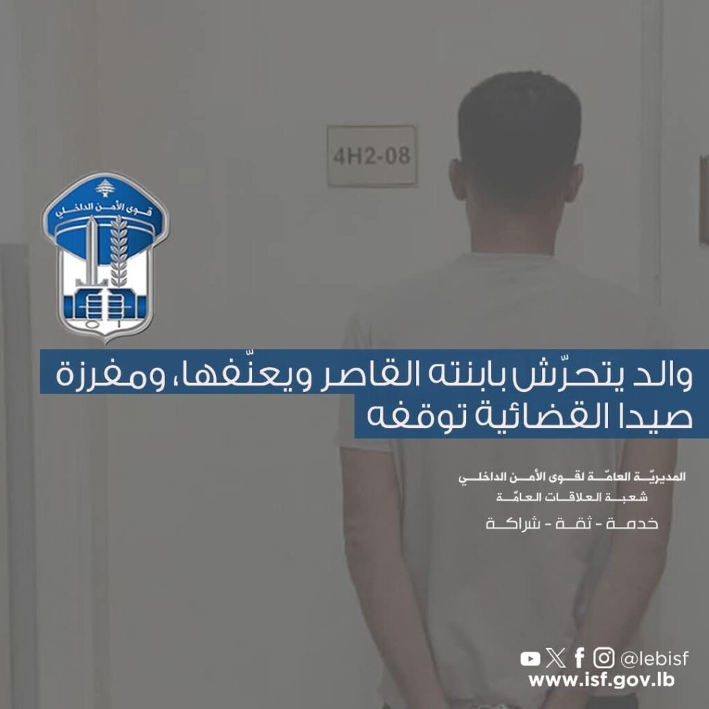 في إطار المتابعة المستمرّة التي تقوم بها قوى الأمن الداخلي لمكافحة مختلف أنواع الجرائم في جميع المناطق اللبنانية، ومنها جرائم التّحرّش الجنسي والعنف الأسري، واستنادًا إلى إخبارٍ من مكتب حمايّة الأحداث في وزارة الشؤون الاجتماعيّة، ورد إلى مفرزة صيدا القضائيّة في وحدة الشّرطة القضائيّة، مبني على ادّعاء فتاة قاصر، بحضور خالتها، حول تعرّضها للتّحرّش الجنسي والعنف الجسدي من قبل والدها في منطقة وادي الفوّار – صيدا، ما اضطرها إلى مغادرة المنزل واللجوء إلى الخالة، كون والدتها لم تتجرأ على الادّعاء ضدّ الأب، خوفًا منه.