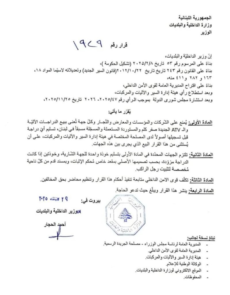 صدر عن وزير الداخلية والبلديات أحمد الحجار قرار جديد يهدف إلى ضبط فوضى الدراجات الآلية والـATV في لبنان، ومنع تداولها خارج الأطر القانونية، لما لذلك من انعكاسات مباشرة على السلامة العامة وحوادث ال