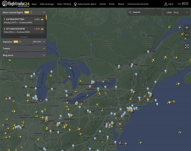 ستخلص موقع Flightradar24 بيانات الموقع والارتفاع والسرعة والاتجاه والمسار، ويربطها بجداول رحلات المطارات وشركات الطيران. عندما سافرت رئيسة مجلس النواب الأمريكي نانسي بيلوسي إلى تايوان عام 2022 تحت تهديدات من الصين، تابع طائرتها 2.92 مليون شخص، وبلغ عدد المشاهدين في ذروة الرحلة 708 آلاف شخص. وعندما نُقل جثمان الملكة إليزابيث من لندن، سجل أكثر من 5 ملايين متزلج على الأمواج رقماً قياسياً عالمياً. فكيف يحدث هذا؟
