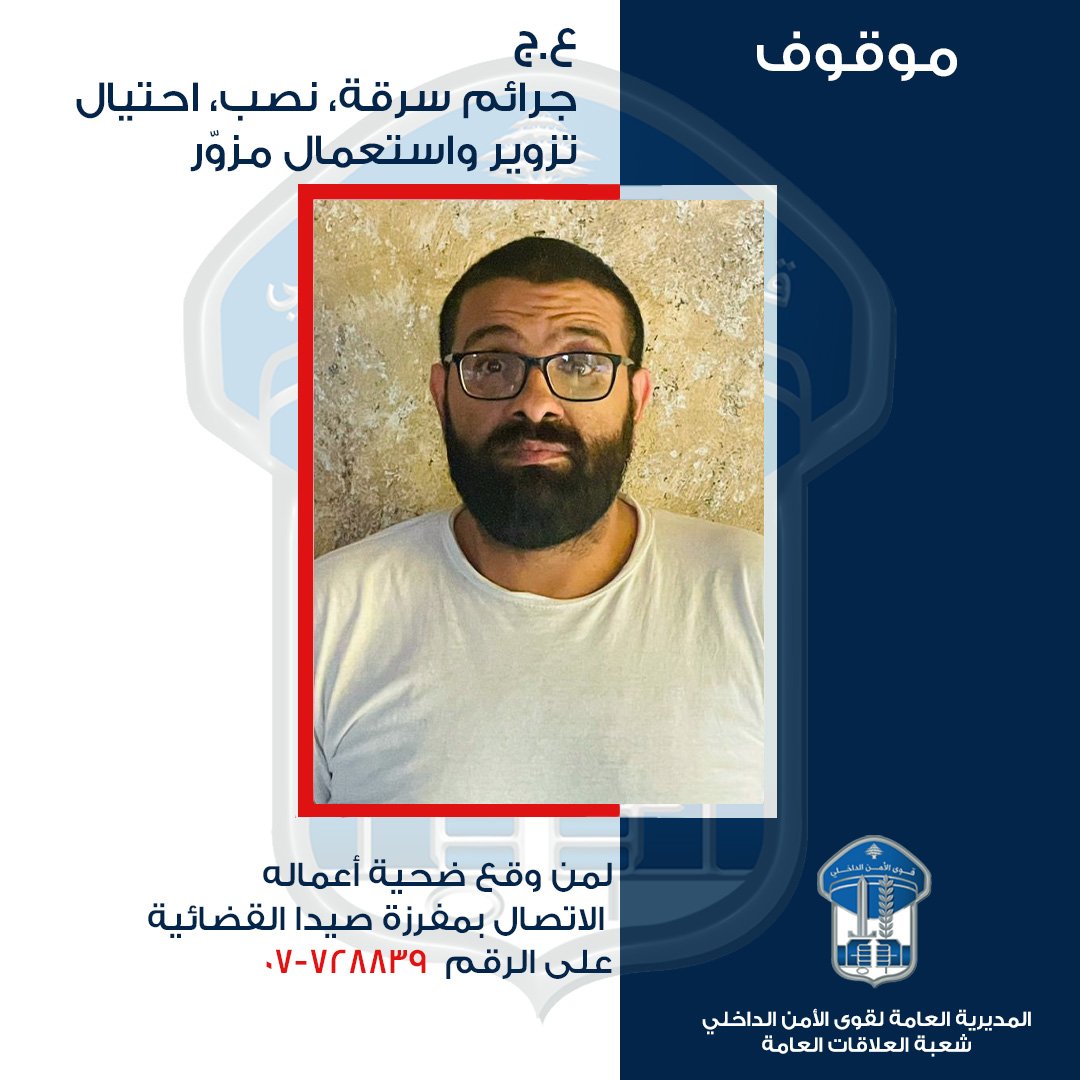 تُعمّم المديريّة العامّة لقوى الأمن الدّاخلي، صورة الموقوف (ع. ج.)، بناءً على إشارة القضاء، وتطلب مِمّن وقع ضحية أعماله التّوجه الى مفرزة صيدا القضائية، أو الاتّصال على الرقم 728839-07 تمهيداً لاتّخاذ الإجراءات القانونيّة اللّازمة.