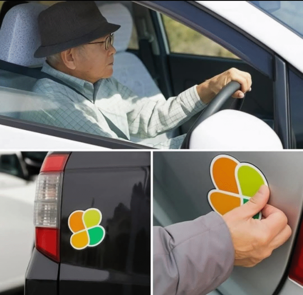 علامة بألوان البرتقالي والأخضر والأصفر، تُشبه ورقة نبات ، توضع على سيارات من تجاوزوا السبعين من العمر. يُطلق عليها “كوريشا مارك” (Koreisha mark)، وهي ليست زينة ولا مجرد ملصق، بل رسالة واضحة: “سائق هذه السيارة يحمل سنوات من الحكمة والتجربة… فكن صبورًا.”