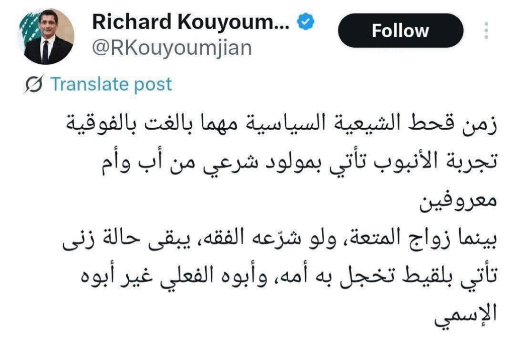 منشور منسوب للوزير السابق ريشار قوميجيان ويشغل منصب رئيس العلاقات الخارجية في حزب القوات اللبنانية التي يقودها سمير جعجع المرفق ادناه :