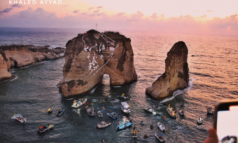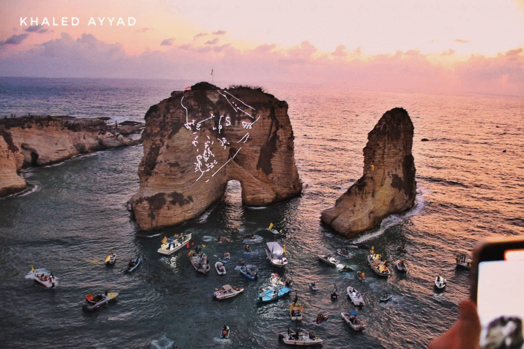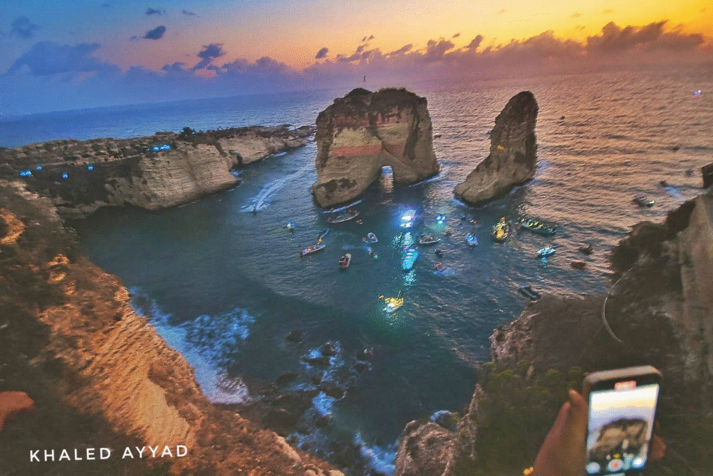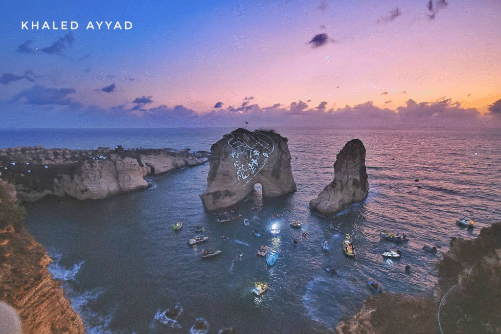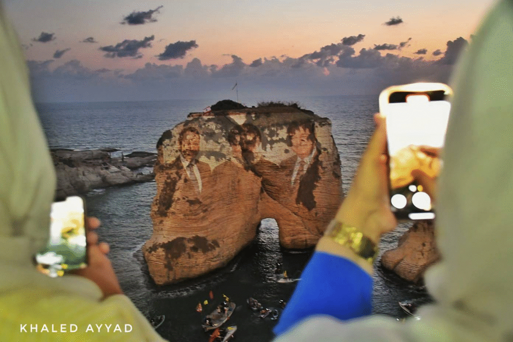 من كل حدب وصوب , حتى من القرى والمدن المدمرة والتي تحاصرها الحكومة اللبنانية وتمنع اعادة بنائها , ورغم المعناة والتهجير وانسداد الأفق تلاقى المؤمنون بخيار المقاومة : مسلمين ( شيعة وسنة ) ومسيحيين ودروز , من الجبل وطريق الجديدة ومن كافة انحاء بيروت تلاقوا عند صخرة الروشة التي لم تكن هدفا ولا حلما ليلتقوا امامها , فما هي الا صخرة صماء وان كان الله وهبها مسحة جمالية , وبدل ان يكونوا بالعشرات اصبحوا رويدا رويدا بالمئات ثم بعشرات الألوف … اضاؤا الصخرة بالعلم اللبناني ثم بصورة سيديهم ثم بصورة الأخ الأكبر وبصورة شهيد لبنان الأكبر الشيخ رفيق الحريري ونجله رئيس الحكومة المبعد ظلما وقهرا عن ممارسة عمله السياسي الوطني .